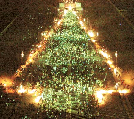 在臺(tái)灣省高雄市夢(mèng)時(shí)代廣場(chǎng)旁的時(shí)代大道上,一場(chǎng)“萬(wàn)輪壓馬路、排棵圣誕樹”活動(dòng)正在舉行。只見五萬(wàn)人騎自行車或踩直排輪游行后,在時(shí)代大道上聚集排出一棵長(zhǎng)兩百米、寬八十米號(hào)稱世界最大的圣誕樹,場(chǎng)面相當(dāng)壯觀。臺(tái)灣《中國(guó)時(shí)報(bào)》圖
