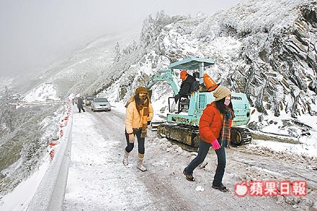 合歡山昨天從鳶峰以上的道路就開始出現(xiàn)積雪,太魯閣公園與埔里工務(wù)段雖多次出動鏟雪車清除路面積雪,但因車輛涌入,再加上鳶峰到武嶺、合歡山莊的道路狹窄,連鏟雪車都無法順利通行,不少車主因欠缺雪地行車經(jīng)驗,更發(fā)生車子打滑擦撞意外,甚至直接撞上山壁。部份駕駛?cè)四筒蛔⌒宰尤我獬,造成交通打結(jié),讓塞車狀況更為嚴(yán)重,武嶺以下塞車即長達(dá)7公里。