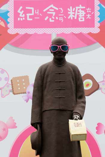 中新網(wǎng)4月10日電 據(jù)“中央社”報(bào)道,臺灣師范大學(xué)“糖果屋”裝置藝術(shù)展演活動10日在臺師大校園舉行記者會,有人把矗立在校園內(nèi)的蔣介石銅像載上大眼鏡變成介紹美食的“紀(jì)念糖糖主”,但卻引來一位老伯伯表達(dá)不同看法,認(rèn)為這樣“不尊重的蔣公”。