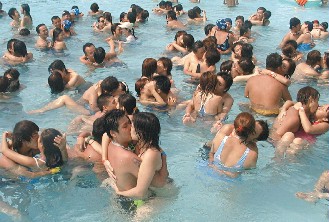 中新網(wǎng)7月30日電 臺(tái)北縣八里鄉(xiāng)八仙水上樂園4年前舉辦“愛的啵!逼呦η槿斯(jié)活動(dòng),吸引百余對情侶在水中忘情擁吻。今年8月7日“七夕”要挑戰(zhàn)更高難度,舉辦“水底接吻競賽”,第一名可獲得水中數(shù)碼相機(jī)1臺(tái)。