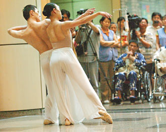 云門舞集成立已經(jīng)三十五周年,在全臺十九家醫(yī)院推出“醫(yī)院里的春天”巡演,把舞臺搬到醫(yī)院。臺大醫(yī)院昨天過113周年生日,云門舞者帶來“水月”的精華片段,沒有另外搭舞臺,沒有燈光,在樸實的醫(yī)院大廳上演最真實的感動,駐足的觀眾把舞者團(tuán)團(tuán)圍住,還有病人坐著輪椅觀賞。