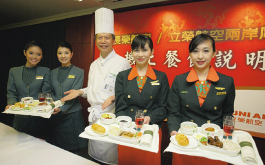 兩岸周末包機(jī)公司不只搶頭班機(jī)、比載客率,在餐點(diǎn)上也相互較勁。華航昨(1)日宣布商務(wù)艙將推出臺(tái)北故宮“晶華國寶宴”,圖中長榮、立榮則推出涵蓋兩岸各地的風(fēng)味菜色。(臺(tái)灣《聯(lián)合報(bào)圖》)