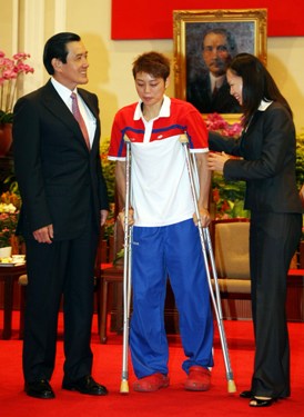 馬英九接見中華臺(tái)北奧運(yùn)代表團(tuán),與受傷的跆拳道選手蘇麗文(中)合影。(“中央社”圖)