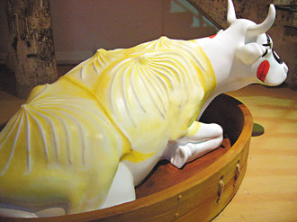 臺(tái)灣的奔牛節(jié)開放創(chuàng)作現(xiàn)場(chǎng)(華山創(chuàng)意園區(qū)),最近每隔一段時(shí)間,現(xiàn)場(chǎng)就會(huì)換上一批花色不同的牛,有時(shí)還可看到正在創(chuàng)作的藝術(shù)家,如莊普現(xiàn)正創(chuàng)作“三只鹿”,讓牛披上了梅花鹿的皮,就有點(diǎn)“指牛為鹿”的味道。洪天宇的牛,內(nèi)臟器官全部外露。