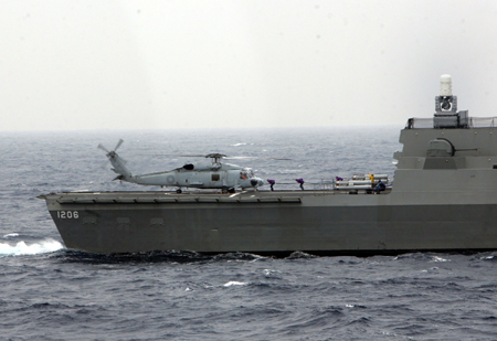 S-70C反潛直升機(jī)降落迪化級(jí)軍艦飛行甲板,仿真加油及魚(yú)雷管掛卸載作業(yè)。
