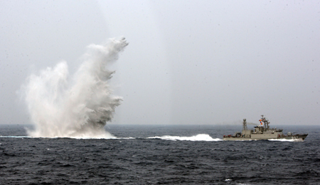 錦江級(jí)巡邏艦施放深水炸彈制壓對(duì)手潛艇水下活動(dòng)。