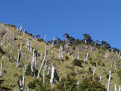 從塔塔加到排云山莊,最壯觀的景色之一,可能就是白木林了。位于距塔塔加步道口約5公里處之白木林,從觀景臺(tái)往山坡上望去,盡是一棵棵白色、孤寂矗立的枯木,白木林是森林遭受火焚后所殘余下來(lái)的枝干,經(jīng)過(guò)風(fēng)吹、日曬及雨淋等作用,樹(shù)皮逐漸剝落,只剩下白色木質(zhì)的一種特殊景觀。白木林主要樹(shù)種為冷杉和鐵杉,其中鐵杉較多,樹(shù)干挺直者為冷杉,樹(shù)干彎曲多分枝者為鐵杉。