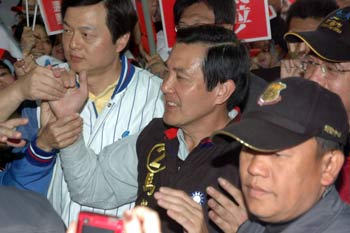 選舉選情緊繃,馬英九(中)21日北縣掃街前,在新店受到民眾相當熱情的包圍,爭相握手。特勤與維安人員則繃緊神經,隨時貼身護衛(wèi)馬英九以防萬一。 “中央社”圖