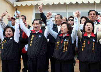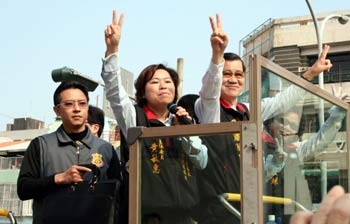 國(guó)民黨“副總統(tǒng)”候選人蕭萬長(zhǎng)(右一)21日上午回故鄉(xiāng)嘉義市進(jìn)行車隊(duì)掃街拜票,呼吁鄉(xiāng)親要“家己人要挺嘉義人”,讓馬蕭過關(guān)。