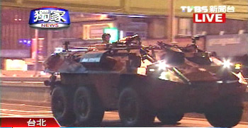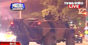 據(jù)臺灣 TVBS報道,凌晨零時三十分左右,四輛裝甲車開上臺北街頭,憲兵跟警車一路跟隨。隊(duì)伍從中華路一路轉(zhuǎn)進(jìn)中山北路,再到憲兵司令部,整個兵推過程歷時十五分鐘。