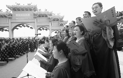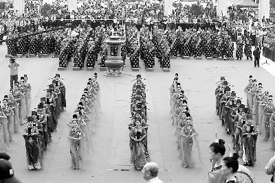 上午9點(diǎn)半,此次活動(dòng)的重頭戲——保生大帝頌典儀式開始。在數(shù)通鳴鐘響鼓之后,兩列身著錦衣、手持斧鉞的古裝衛(wèi)士沿著石階緩緩而下,海滄青礁慈濟(jì)宮理事長(zhǎng)呂根銓、臺(tái)灣保生大帝信仰總會(huì)創(chuàng)會(huì)理事長(zhǎng)廖武治作為主祭人,率領(lǐng)290座各地宮廟代表,在保生大帝神像前開始隆重的頌典儀式。詠?zhàn)x頌文、獻(xiàn)花獻(xiàn)果、贊唱,吸收了祭孔、祭黃帝和祭媽祖的保生頌典儀式,讓現(xiàn)場(chǎng)的兩岸鄉(xiāng)親大飽眼福。頌典儀式上還進(jìn)行了充滿懷古思緒的歌舞表演,身著多彩輕紗的舞者翩翩起舞,幾十人的古裝儀仗隊(duì)整齊排列于兩旁,盡顯盛大莊重的氣氛,也向現(xiàn)場(chǎng)所有來(lái)賓展示了中華文化的禮儀和鮮活的民俗文化。