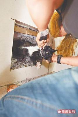 原本協(xié)助救援的照顧生命協(xié)會與一樓的鞋店商量,企圖敲破墻壁救貓,但店家不愿意,昨因貓咪再度發(fā)出求救聲音,店家心軟同意,消防隊員及水電工程人員立刻輪番將水泥墻鉆洞,終于救出受困5天的貓咪。