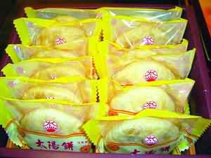 太陽餅是一種源起于臺灣臺中市的點(diǎn)心,又被稱做酥餅,是一種甜餡薄餅,為臺中的名產(chǎn)之一,通常是盒裝作為特產(chǎn)禮物,消費(fèi)者在知名的店家購買往往須先事先預(yù)訂,并在現(xiàn)場大排長龍領(lǐng)取。但除了在這些知名店家購買外,在臺中地區(qū)車站的特產(chǎn)店也可以買到太陽餅。
