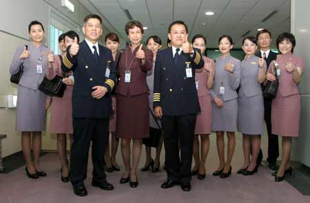 兩岸周末包機(jī)四日啟動,首班桃園至上海的華航包機(jī),機(jī)組員在登機(jī)門前豎大姆指,象征“飛航第一、飛安第一”。