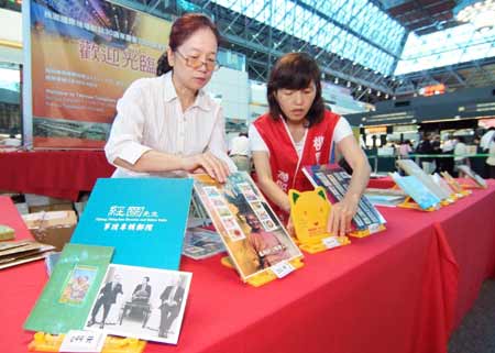 慶祝大陸觀光首發(fā)團來臺,臺灣郵政公司四日在桃園機場發(fā)行紀念郵票,票面包括馬英九、蔣經(jīng)國等人的肖像。