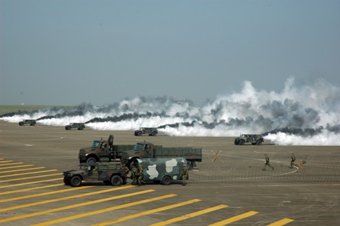 臺軍第五作戰(zhàn)區(qū)“漢光24號”演習(xí),23日在臺中清泉崗空軍基地舉行空降暨反空降演練。圖為煙幕排以五輛渦輪發(fā)煙車,對空降場實施煙幕遮障。(“中央社”圖)