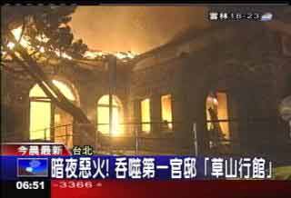 “草山行館”是蔣介石夫婦到臺(tái)灣后的第一個(gè)住處,只是蔣介石的二十余處官邸之一,名聲遠(yuǎn)不及“士林官邸”,因?yàn)樾袕狡В慰土攘葻o幾!安萆叫叙^”從未能成為“尊蔣”的標(biāo)志,卻因?yàn)檫@把火,成為了“去蔣”運(yùn)動(dòng)達(dá)至高潮的象征。