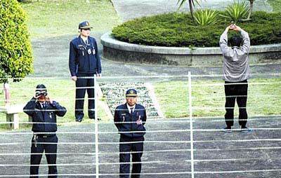 扁放風(fēng)時(shí),故意背對(duì)媒體做體操,管理員也對(duì)媒體進(jìn)行監(jiān)看。