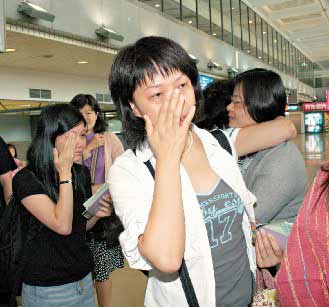 大陸踩線團上午搭澳門航空離臺,團員難舍臺灣工作人員,相互擁抱淚流。每個團員都滿載而歸,有臺灣特產(chǎn)、水果、旅游資料。 《聯(lián)合晚報》圖
