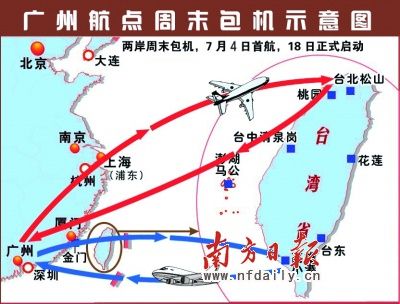 記者從國家民航局獲悉,后日首次周末包機(jī)共有18班包機(jī)往返兩岸,大陸航空公司分別由北京、上海(浦東)、廣州、廈門和南京5個(gè)首批開放航點(diǎn)往返臺(tái)北桃園和松山兩個(gè)機(jī)場,臺(tái)灣公司則由臺(tái)北、臺(tái)中、高雄、花蓮、澎湖5城市飛往北京、上海、廣州、廈門。
