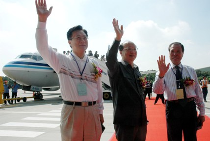 兩岸周末包機臺灣中部四縣市廈門首航訪問團四日啟程,臺中縣長黃仲生(右至左)、臺中市長胡志強、彰化縣長卓伯源三人在登機前向歡送的各界揮別。(“中央社”圖)