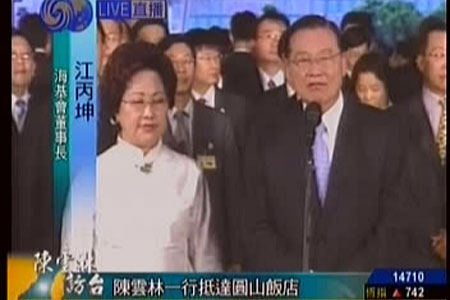 剛剛我在電視上看到11點(diǎn)58分,陳會(huì)長(zhǎng)、陳夫人踏上臺(tái)灣寶島這塊地上,這一刻,不只是臺(tái)灣的民眾在看、大陸的民眾在看,全世界都在看。因?yàn)椋@是歷史的一刻,在兩岸交流史上,這一刻整整花了60年;在兩會(huì)成立以來(lái),也是歷史性的一刻,是第一次在臺(tái)北舉行兩會(huì)的會(huì)談;對(duì)兩岸關(guān)系的發(fā)展,也是關(guān)鍵的一刻。因?yàn),它是兩岸和平?jīng)濟(jì)雙贏的重要的一步。