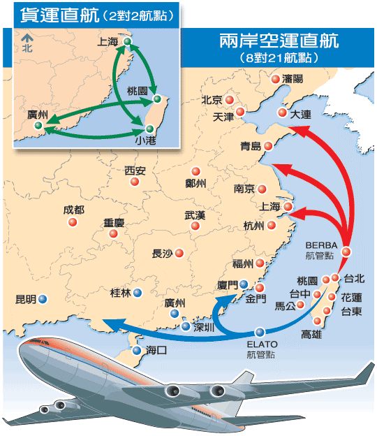 根據(jù)協(xié)議,兩岸直航將不必再繞經(jīng)香港飛航情報(bào)區(qū),以臺(tái)北飛上海為例,截彎取直后的飛行時(shí)間將由原先的2個(gè)半小時(shí)縮短為只需82分鐘,比從臺(tái)北搭高鐵到高雄還要快很多。