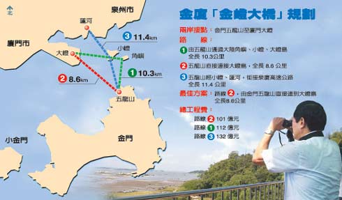 根據(jù)金門(mén)縣府初步規(guī)劃,金嶝大橋有三案,甲案由金門(mén)縣五龍山經(jīng)大陸角嶼、小嶝島,銜接至大嶝島,全長(zhǎng)10.3公里;乙案由五龍山,直接連到大嶝島,全長(zhǎng)8.6公里,距離最短;丙案由五龍山,銜接泉州市的蓮河地區(qū),全長(zhǎng)11.4公里。