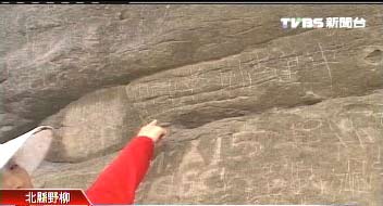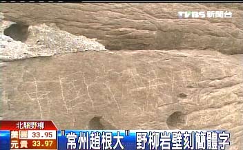 據(jù)臺(tái)灣TVBS報(bào)道,27日當(dāng)天有人在野柳地質(zhì)公園看到大批陸客,隨后就在陸橋旁的巖壁發(fā)現(xiàn)被刻上簡體字樣“中國常州趙根大”,還有一個(gè)常州同鄉(xiāng)“盧建中”也來插花,又聽到園區(qū)廣播“來自常州的旅客,請(qǐng)盡速集合”,直覺“趙根大”真有其人。地質(zhì)公園經(jīng)營業(yè)者湯錦惠無奈地說,要麻煩導(dǎo)游倡導(dǎo)不要破壞景觀。