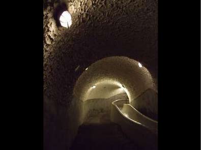 記者當(dāng)日潛入探險(xiǎn)的即為西密道。這條看似簡(jiǎn)單的密道長(zhǎng)180米,高210公分、寬223公分,有86臺(tái)階、45個(gè)防爆燈,滑梯90米長(zhǎng),還設(shè)有獨(dú)立電源、空調(diào)、排水、緊急廣播。建材則是防爆白洋灰、鋼筋水泥。密道坡度很陡,一路走下,就彷佛進(jìn)入了時(shí)光隧道,四周昏暗慘白的氛圍,嘿,還真感覺(jué)到一些風(fēng)聲鶴唳的緊張氣氛。雖說(shuō)從建好到現(xiàn)在,密道完全沒(méi)有使用過(guò),詭異的是,光滑的溜滑梯上卻留有許多黑色長(zhǎng)條刮痕,難道是人沒(méi)使用過(guò),卻曾運(yùn)輸過(guò)槍械軍火?
