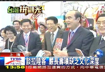 臺(tái)灣觀光協(xié)會(huì)要嚴(yán)長(zhǎng)壽帶領(lǐng)金門(mén)連江宜蘭花蓮到上海,營(yíng)銷臺(tái)灣旅游,面對(duì)先前北京喊出百萬(wàn)人游臺(tái),嚴(yán)長(zhǎng)壽感嘆,光喊拉大陸客的口號(hào)不夠,臺(tái)灣拼觀光還是缺乏文化深度。