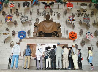 臺當(dāng)局推行“去蔣”政策,臺北中正紀(jì)念堂的蔣介石銅像被各式風(fēng)箏遮擋。4月1日起風(fēng)箏等將全部拆除,還大廳原貌。(圖:臺灣《聯(lián)合報(bào)》)