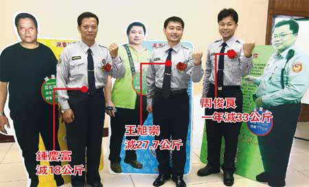 專業(yè)警察單位第1名的鐵路警察局警員鐘慶富利用飲食控制跟慢跑快走,3個月內(nèi)成功減下18公斤。女警方面,花蓮縣警察局督察室督察員連錦秀05年產(chǎn)后胖了30公斤,利用中午游泳及騎自行車,成功減下30公斤,都是減重成功的最佳范例。