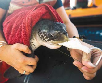 綠色和平組織成員在漁船船身上用紅漆噴上“海盜”字樣,并從該船的長鉤釣線上救下這只欖蠵龜,就地放生。