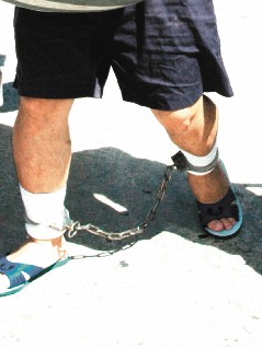 據(jù)稱,綠島監(jiān)獄規(guī)定所有新收受刑人從入獄當(dāng)天起得戴腳鐐?cè)齻月,表現(xiàn)好才解除,因腳鐐皆生銹,常有受刑人的腳磨破,細菌感染得到蜂窩性組織炎,腿腫得跟象腿一般,申請到臺灣就醫(yī),機票及醫(yī)藥費還得自付。
