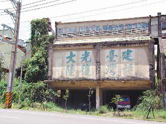 在苗栗縣三灣往南莊風(fēng)景區(qū)路上,有棟廢棄建物墻上仍保留“建設(shè)臺灣,光復(fù)大陸”的斗大標(biāo)語,字跡斑駁,卻引人注目。有人認(rèn)為這些標(biāo)語早已過時,大陸客來臺有極大商機(jī),不必造成大陸客不快,建議涂銷;但也有人認(rèn)為這是當(dāng)年軍隊(duì)轉(zhuǎn)進(jìn)來臺時的標(biāo)語,是兩岸敵對狀況的歷史見證,頗具懷舊風(fēng)味,應(yīng)該保留。