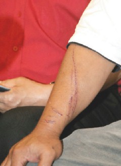 何鴻義出示右手兩道約十公分長(zhǎng)的傷口,他說(shuō),這就是日艦撞船證據(jù)。