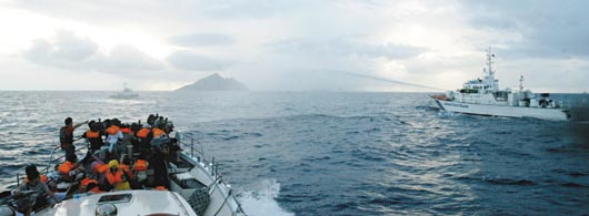 中新網(wǎng)6月17日電 據(jù)臺灣《聯(lián)合報》報道,昨天清晨,臺灣保釣人士乘坐船只“全家!碧枺谂_當(dāng)局海巡部門的護(hù)衛(wèi)下,逐漸接近釣魚島;海巡部門五艘巡防艇也進(jìn)入釣魚島約0.4海里海域,這是臺“海巡署”首次有巡防艦艇在離釣魚島這么近的海域執(zhí)勤。