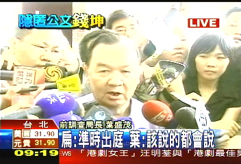 發(fā)表評(píng)論  中新網(wǎng)9月5日電 前臺(tái)灣“調(diào)查局長(zhǎng)”葉盛茂在今天(5日)上午9點(diǎn)15分左右抵達(dá)臺(tái)北地檢署,出席9點(diǎn)半召開(kāi)的偵查庭。葉盛茂在抵達(dá)時(shí)透過(guò)媒體喊話(huà)表示:“我今天會(huì)坦然面對(duì)、具體陳述,也會(huì)充分配合!