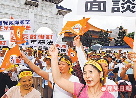 資料圖:2007年是兩岸通婚二十周年,有超過二十五萬名大陸配偶在臺灣生活。但由于當(dāng)局的限制性政策,大陸配偶在島內(nèi)的權(quán)利難以得到保障。07年12月21日,“中華兩岸婚姻協(xié)調(diào)促進(jìn)會(huì)”在“移民署”門前集會(huì),申要人權(quán)與平等待遇。 中新社發(fā) 陳國華 攝
