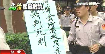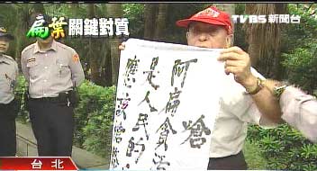 據(jù)臺灣TVBS報道,顧不得被大批警力包圍,有話要說的老伯伯努力甩開束縛,掙扎中,趁機(jī)秀出抗議陳水扁的海報?棺h老伯伯:“你看看應(yīng)該判死刑!對不對!”