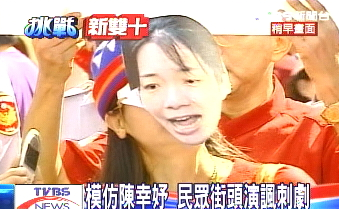 發(fā)表評論  中新網(wǎng)10月10日電 曾經(jīng)在“雙十節(jié)”嗆扁的紅衫軍,今年一樣不缺席。前“立委”林正杰率領(lǐng)紅衫軍演出行動劇,劇中模仿陳水扁女兒陳幸妤多次鏡頭前情緒崩潰的戲碼,諷刺臺灣當(dāng)局辦陳水扁家族洗錢案、機(jī)要費(fèi)案沒有魄力,但由于事前沒有申請,遭到警方舉牌警告。