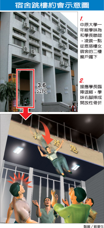 該女生跑到恩慈樓宿舍二樓窗戶,果然看到幾個(gè)男生等在一樓,她毫不猶豫,爬上窗往下跳。