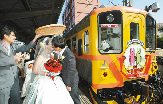 結(jié)婚禮車特別在臺(tái)中縣追分站停下來(lái),讓新人拍照,“追求婚姻得滿分!”賓客們高聲送上祝福。