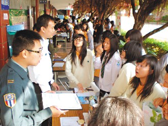 在升學(xué)及就業(yè)博覽會(huì)上,臺(tái)軍北區(qū)人才招募中心的攤位詢問(wèn)度頗高。
