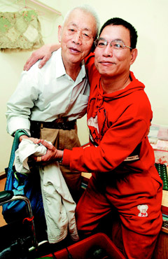 提著藍(lán)色布包,87歲的胡偉昨天早上搭著公交車來到中山女高校門口,加入善愿愛心協(xié)會(huì)志工的行列,這是他七年多來每周日例行活動(dòng),風(fēng)雨無阻。他是協(xié)會(huì)“國(guó)寶級(jí)”志工,因年歲大行動(dòng)較為緩慢,昨天他一如往常與其它志工前往受助人家中,駝著背將捐出的1000元善款交到小他26歲的身障者蔡行展手里。