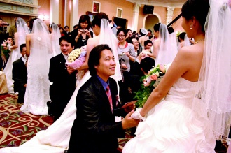 中新網(wǎng)4月16日電 據(jù)臺(tái)灣《聯(lián)合報(bào)》報(bào)道,花蓮縣15日在舉辦集體結(jié)婚,全縣100對(duì)新人完成終身大事,有日本郎娶臺(tái)灣美嬌娘,也有佛教醫(yī)院人員娶基督教醫(yī)院護(hù)士,新人在微微的細(xì)雨中走過(guò)許愿池,誓言情愛一生。