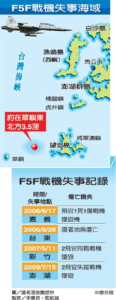 2009年7月15日編號(hào)5410的F-5F戰(zhàn)機(jī),在澎湖石礁靶場執(zhí)行空對地炸射訓(xùn)練失事,飛官黃挺瑜中尉和張良元中校失蹤。