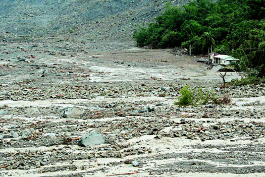 小林村幾乎難以辨認,一片爛泥石堆旁只有兩間民宅。村里民眾說,這兩間民宅本在村子地勢最高處,如今村子被土石流全吞掉,變成鄰近溪邊。房子被埋了,現(xiàn)地靜寂,全無人煙,救難人員無用武之地,雖然背著救援物資千辛萬苦趕來,卻沒救到人,短暫搜尋后撤回甲仙。