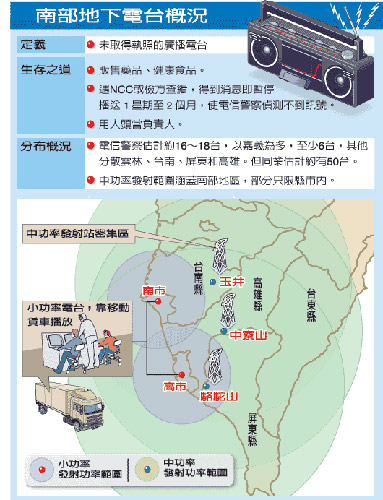 吳姓業(yè)者說,地下電臺(tái)發(fā)射塔多架設(shè)在高雄縣中寮山區(qū),這里有合法電臺(tái)發(fā)射塔,可利用合法掩護(hù)非法;其次高雄電信警察距中寮山約一個(gè)多小時(shí)車程,上山路況又不好,“執(zhí)法單位久久才會(huì)跑一趟”。